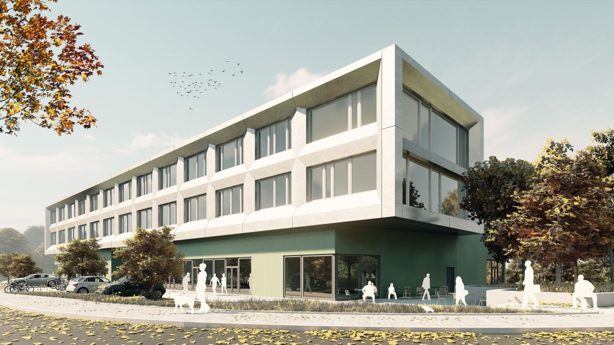 Die Architektur ist geprägt von der Betonung der besonderen städtebaulichen Ecksituation. Auf dem grün geputzten Sockelgeschoss setzt sich ein metallischer Gebäuderiegel mit einer Lochfassade ab und überragt den Sockel. Durch diese Überlappung und Einschnitte im Erdgeschoss entstehen klare Eingangsbereiche, witterungsgeschützt und schattig. Der 2-geschossige Riegel ist geprägt von eine zinksichtigen Stahlblechfassade mit schräggestellten Fensterrahmenverkleidungen.