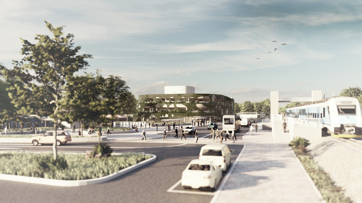 Stadtplatz und Parkhaus bilden einen fließenden, organischen Knotenpunkt. Bahn, Stadtbahn, Busse, PKW, Rad- und Fußverkehr werden hier gebündelt. Der Stadtplatz funktioniert als offenes Wegekontinuum, verlangsamt den Verkehr durch Belagswechsel und ermöglicht sichere, barrierefreie Querungen. Grüne Inseln, Sitzbereiche, Kiosk, Wasserspiel und Pflanzflächen fördern Aufenthalt, Begegnung und Stadterlebnis. Unterschiedliche Bewegungs- und Aufenthaltszonen sind klar ablesbar, ineinandergreifend und attraktiv gestaltet.